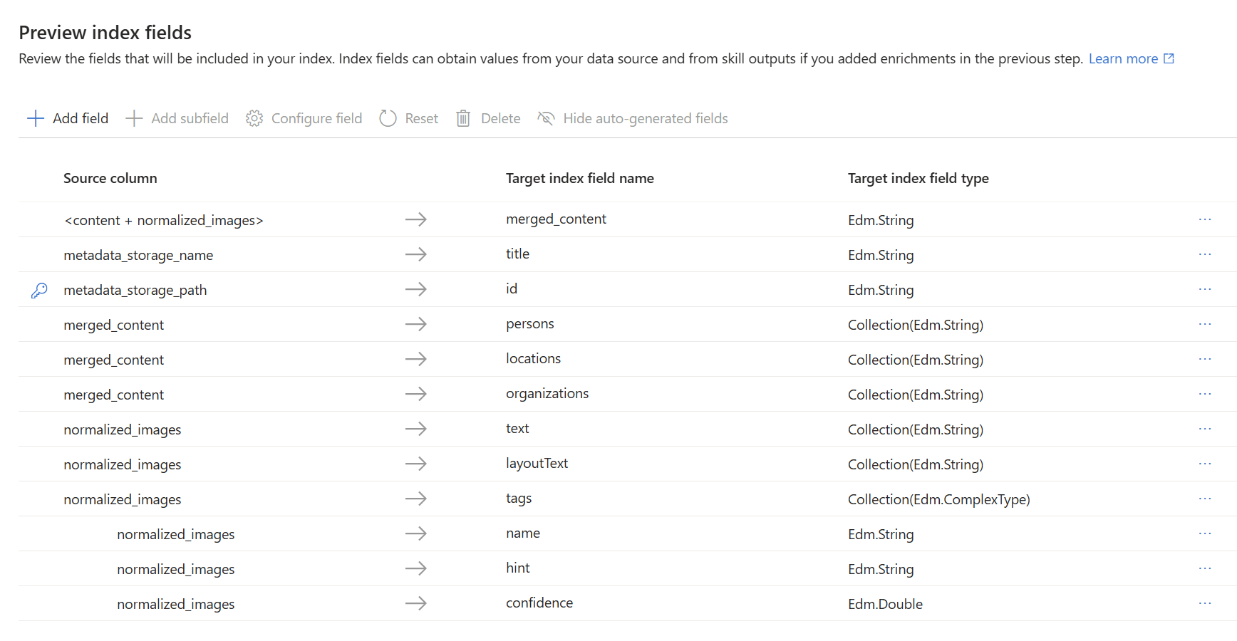metadata_storage_path, which is selected because the field contains unique values.Default field attributes are based on the skills you selected. For example, fields created by the Entity Recognition skill (