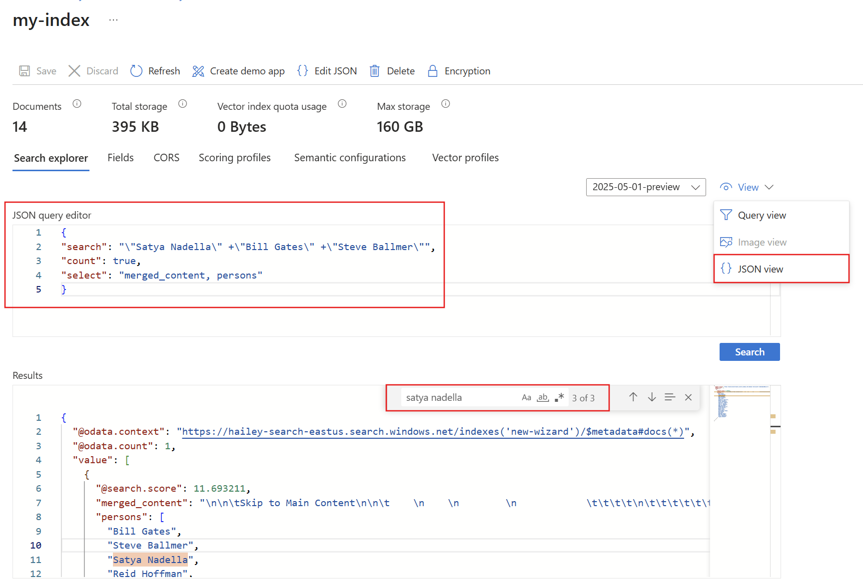 - Switch to the JSON view to specify parameters that shape results.