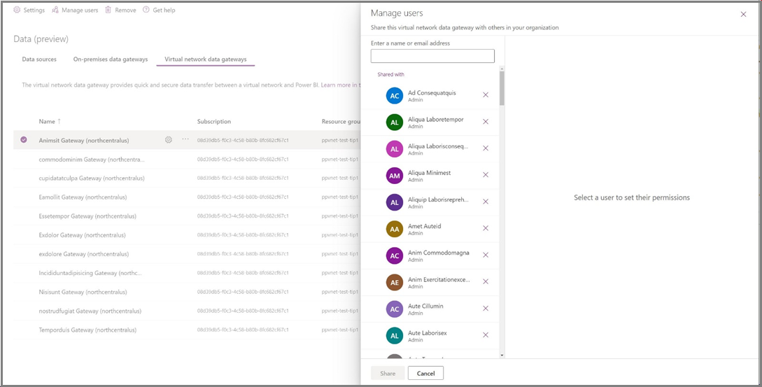 You can manage admins for this VNet data gateway like you do for on-premises data gateways in the Manage Connections and Gateway setting in Fabric and Power BI/ Power Platform admin center. To add or remove admins, select a gateway, and then select Manage Users.