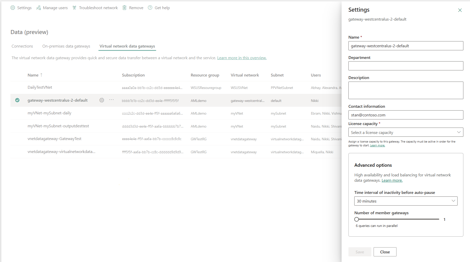 You can view properties for a selected VNet data gateway in the Power Platform admin center by selecting Settings.