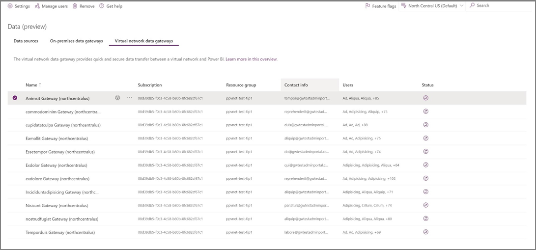 After you create a virtual network (VNet) data gateway, it's available in the Data (preview) > Virtual network data gateways tab in the Power Platform admin center for you to manage. Also make sure you select your tenant's default home region in the region dropdown to display and manage all your VNet data gateways. You select your tenant's default region because the metadata (name, details, data sources, encrypted credentials, and so on) for all your VNet data gateways are stored in your tenant's default region.