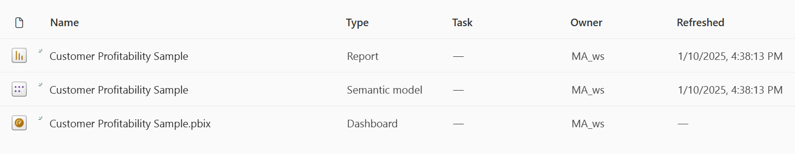 After the upload is complete, your workspace includes three new artifacts: a Power BI report, a dashboard, and a semantic model named Customer Profitability Sample. The steps in this article rely on this semantic model.