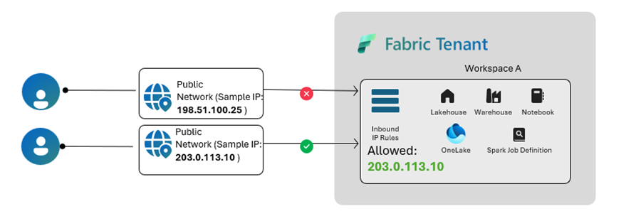- Connections from resources in an approved virtual network through workspace private endpoints When you enable IP firewall rules, Fabric checks each client's public IP address against your configured allow list before granting access to workspace items. Only connections from approved IP addresses can access items such as Lakehouses, Warehouses, OneLake shortcuts, Notebooks, and Spark Job Definitions. All other connection attempts are denied.