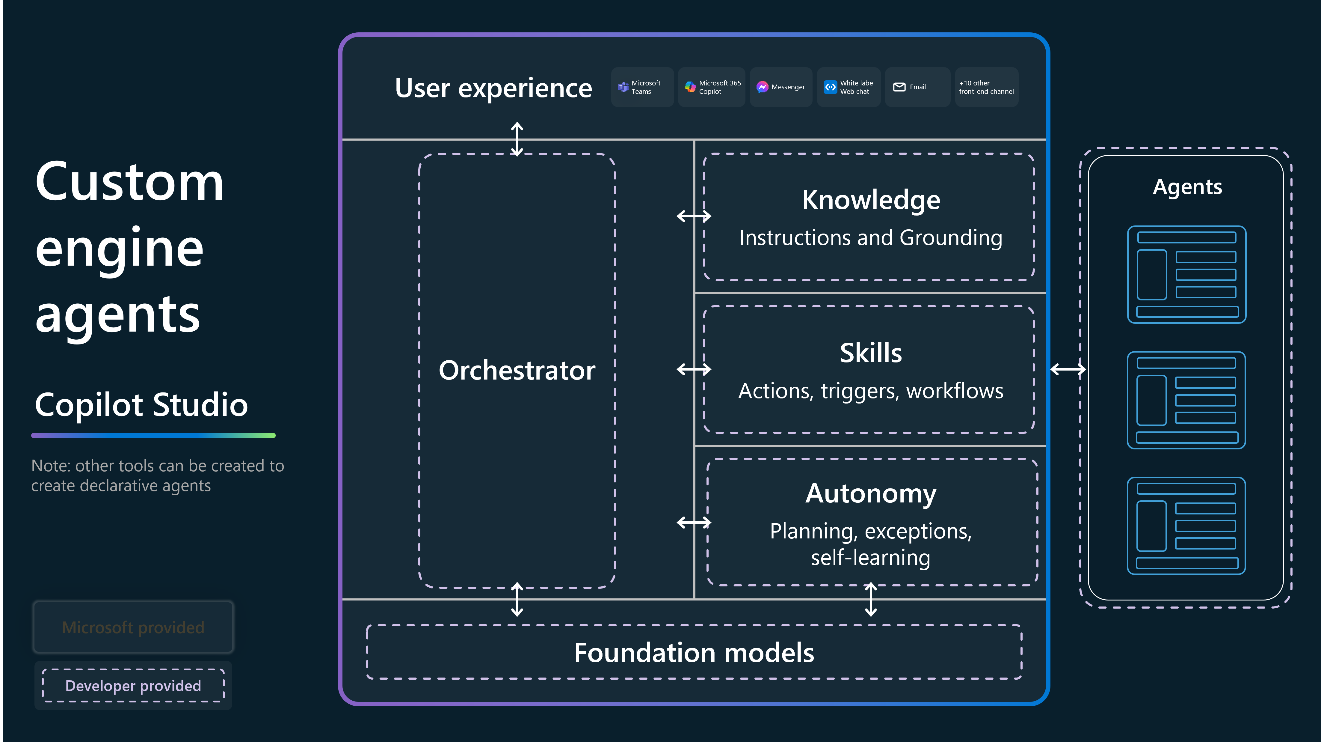 Custom engine agents offer maximum flexibility for advanced scenarios that need custom logic, external APIs, or complex orchestration.