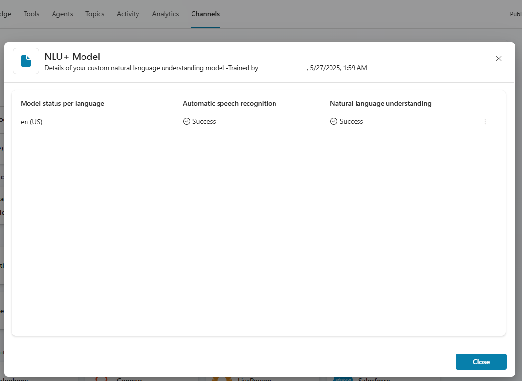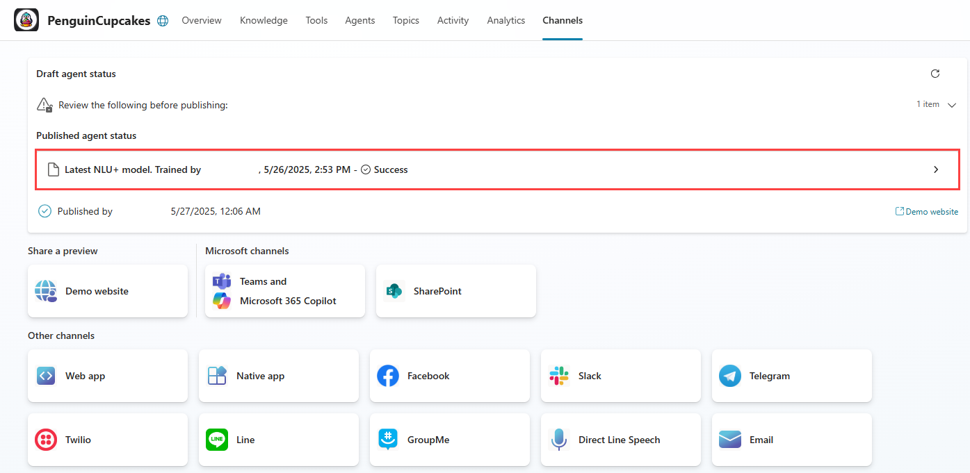 NLU+ model training times vary, based on the complexity of the model. The Channels page displays the model training status. Once training is completed, details about the trained model are displayed, including the user who initiated the training, when the training completed, and the status.