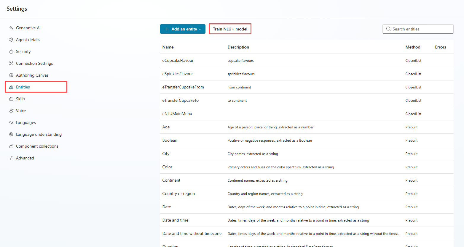 After adding your training data and you're satisfied with it, select the Train NLU+ model button. The button is available in the Topics page or the Entities settings page.