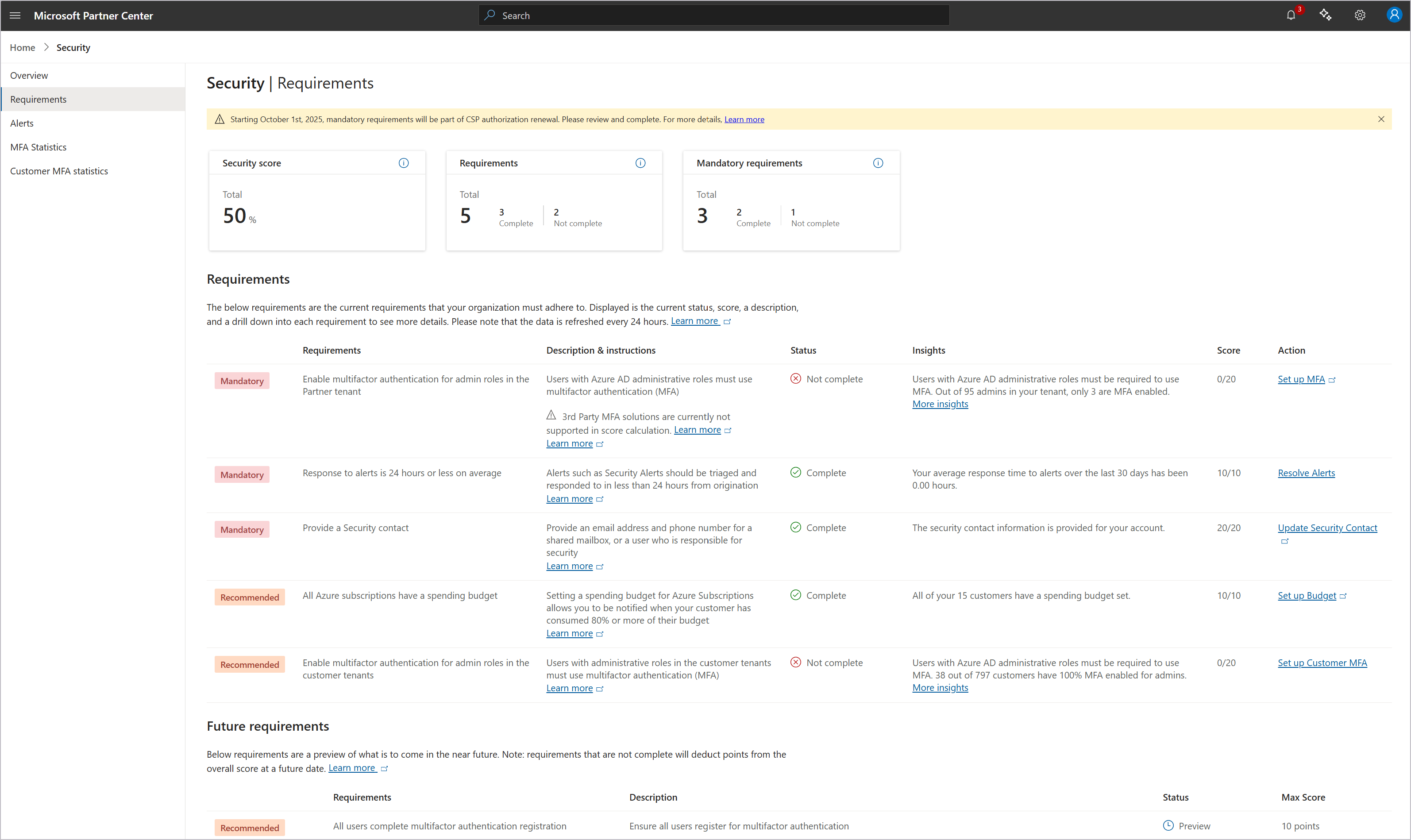 The Future requirements section shows a preview of requirements that will be implemented soon. Requirements that aren't complete will deduct points from the overall score at a future date.
