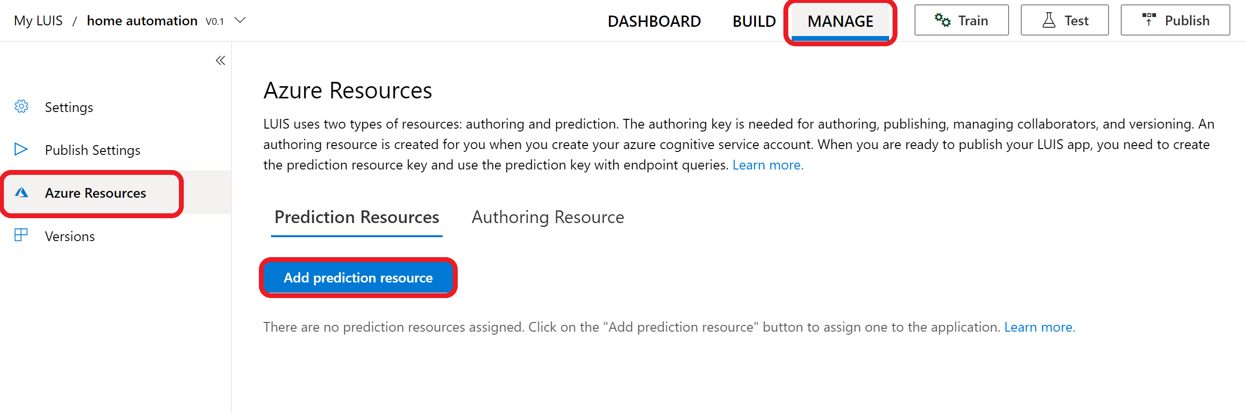 On the Prediction resource or Authoring resource tab, select the Add prediction resource or Add authoring resource button.