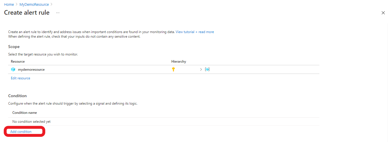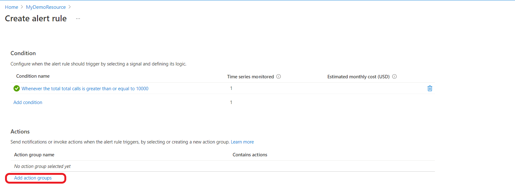 To send notifications or invoke actions when the alert rule triggers go to the Actions section and add your action group.