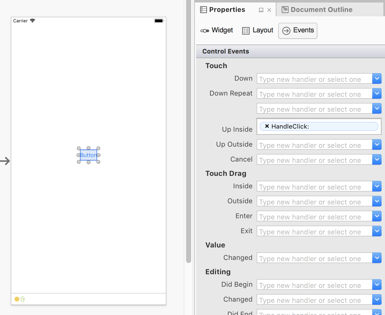 To specify custom event handlers for various events, use the Events tab of the Properties Pad. For example, in the screenshot below, a HandleClick method handles the button's Touch Up Inside event: