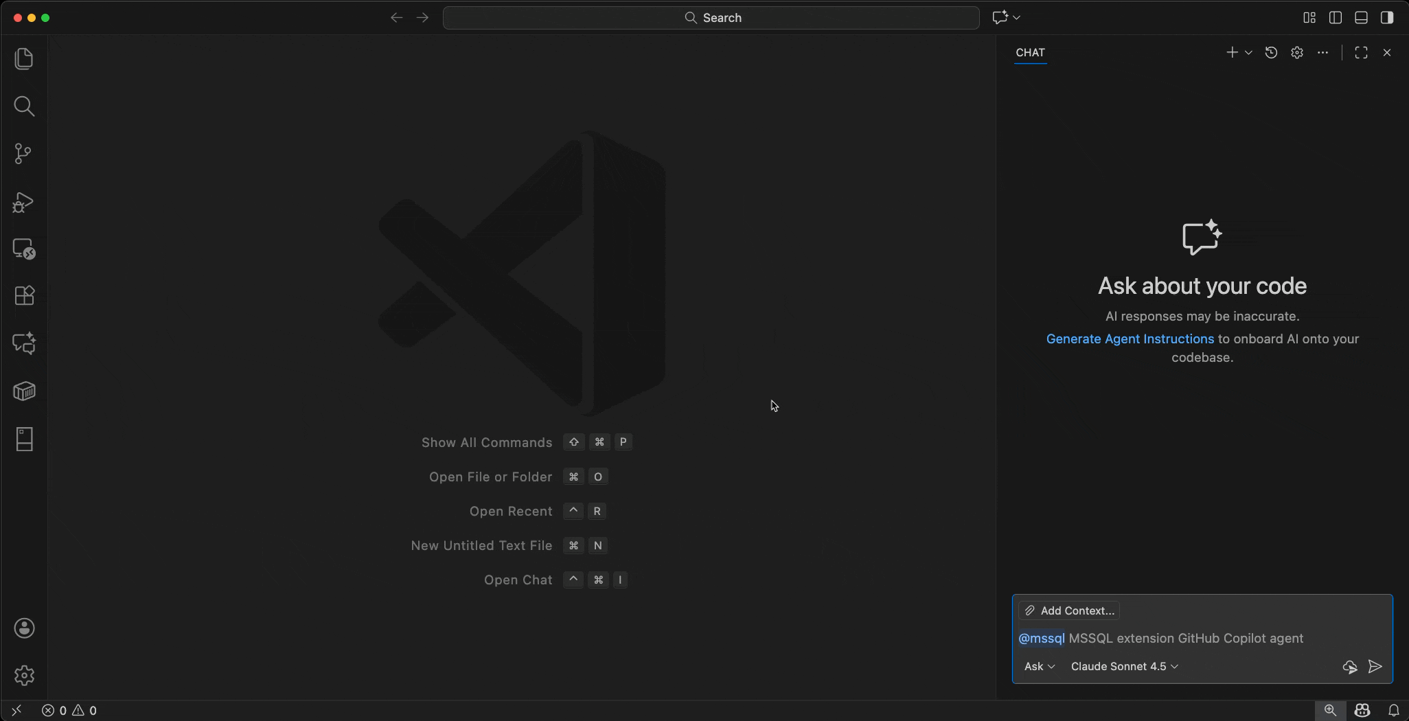 The GitHub Copilot integration with the MSSQL extension for Visual Studio Code provides AI-assisted SQL development. You can use it to write and optimize database code, generate and modify schemas, understand existing logic, and work with code-first and data-first database development patterns.