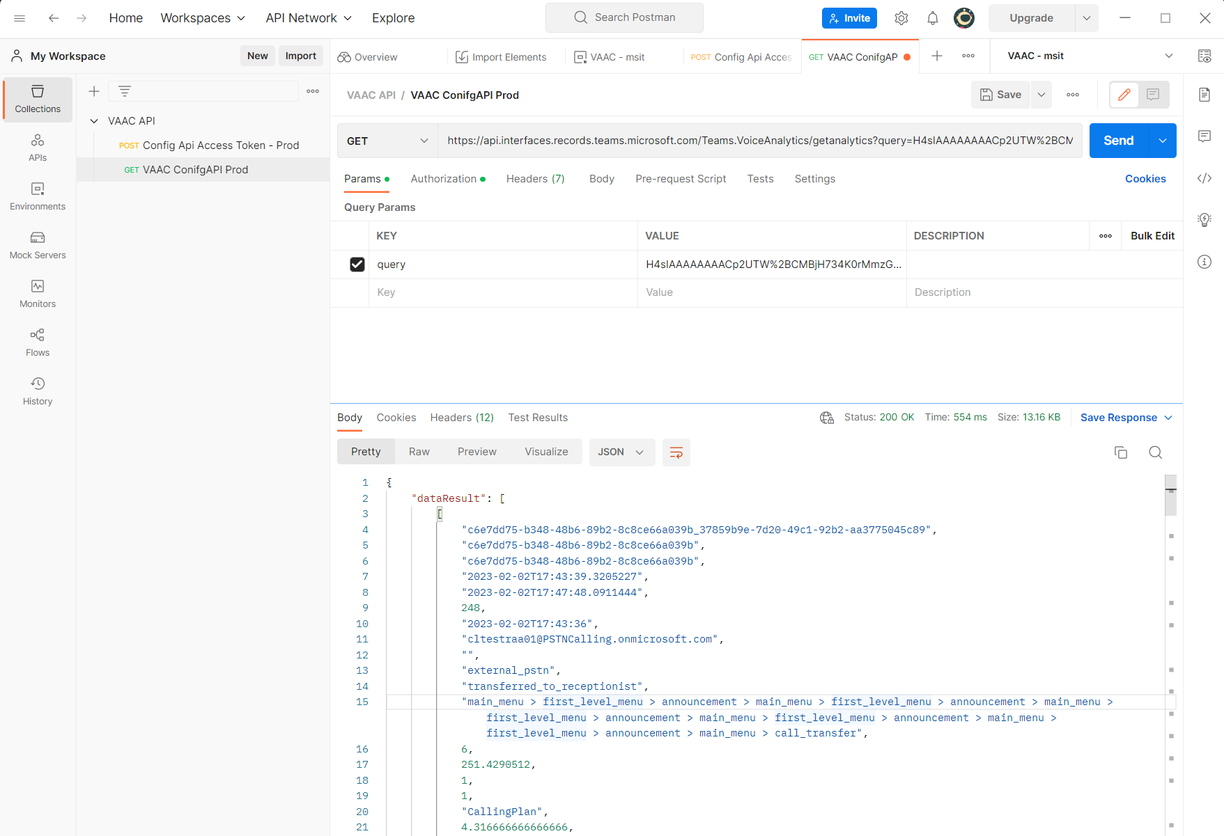 Any application that can access RESTful web services can use the VAAC API to retrieve historical data. In the following example, Postman is used.