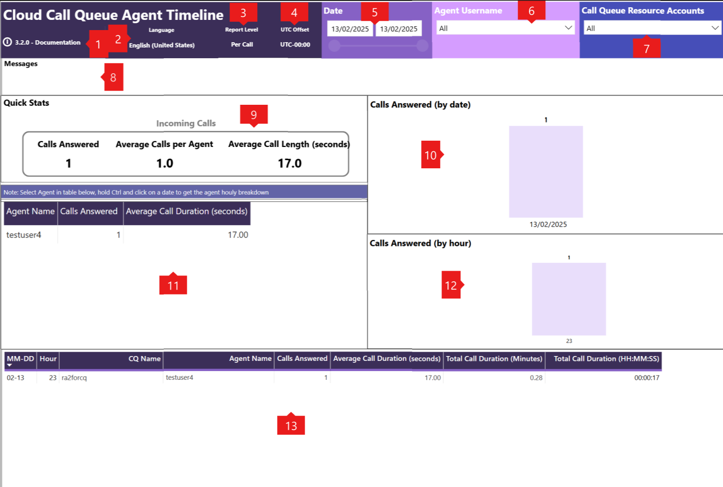 | 9 | Quick Stats -> Incoming Calls | The breakdown shows the total number of calls received between the start date/start hour and end date/end hour. TIP: Hover over any metric in this section to display a tooltip with the individual calls that make up the total. |