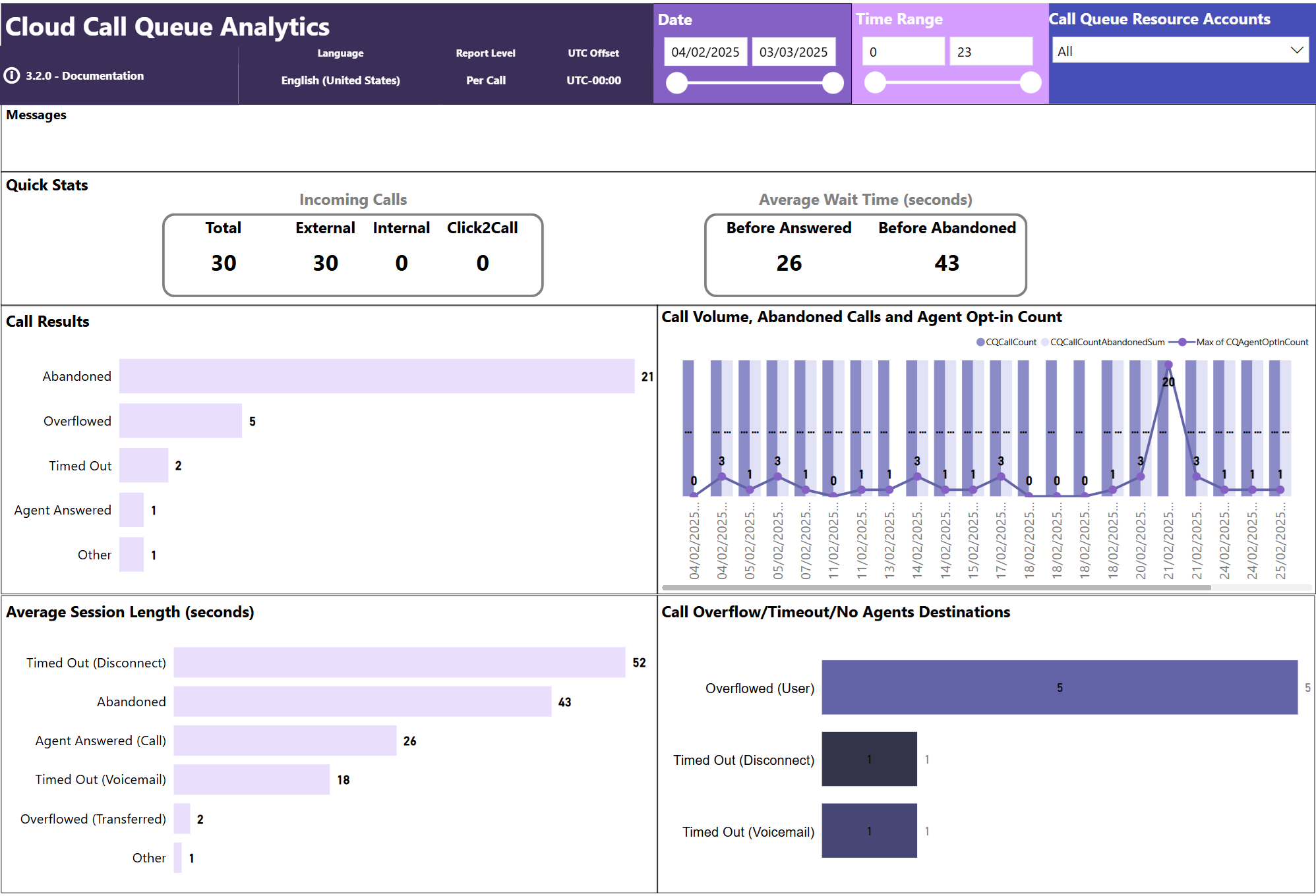 The Teams Auto Attendant & Call Queue Historical Report Power BI template contains the following three reports: