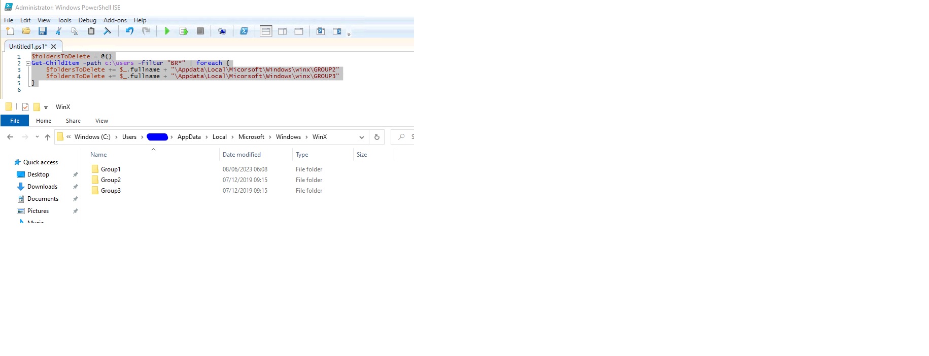 I am looking for a script which should delete folders under C:\Users\BRXXXX\Appdata\Local\Micorsoft\Windows\winx\GROUP2 and GROUP3