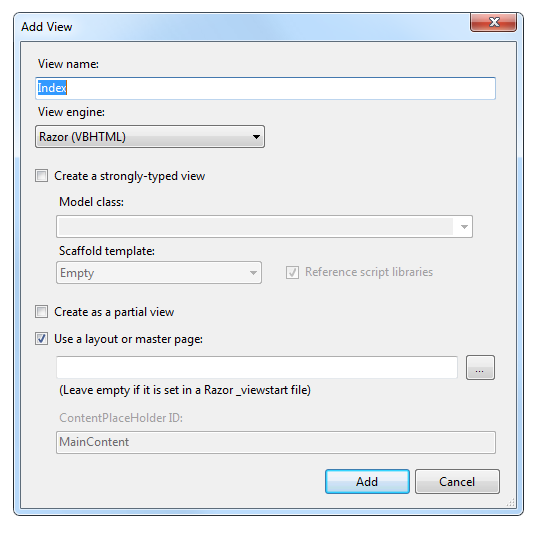 Open MvcMovie\Views\HelloWorld\Index.vbhtml. There are two places to make a change: first, the text that appears in the title of the browser, and then in the secondary header (the <h2> element). We'll make them slightly different so you can see which bit of code changes which part of the app.