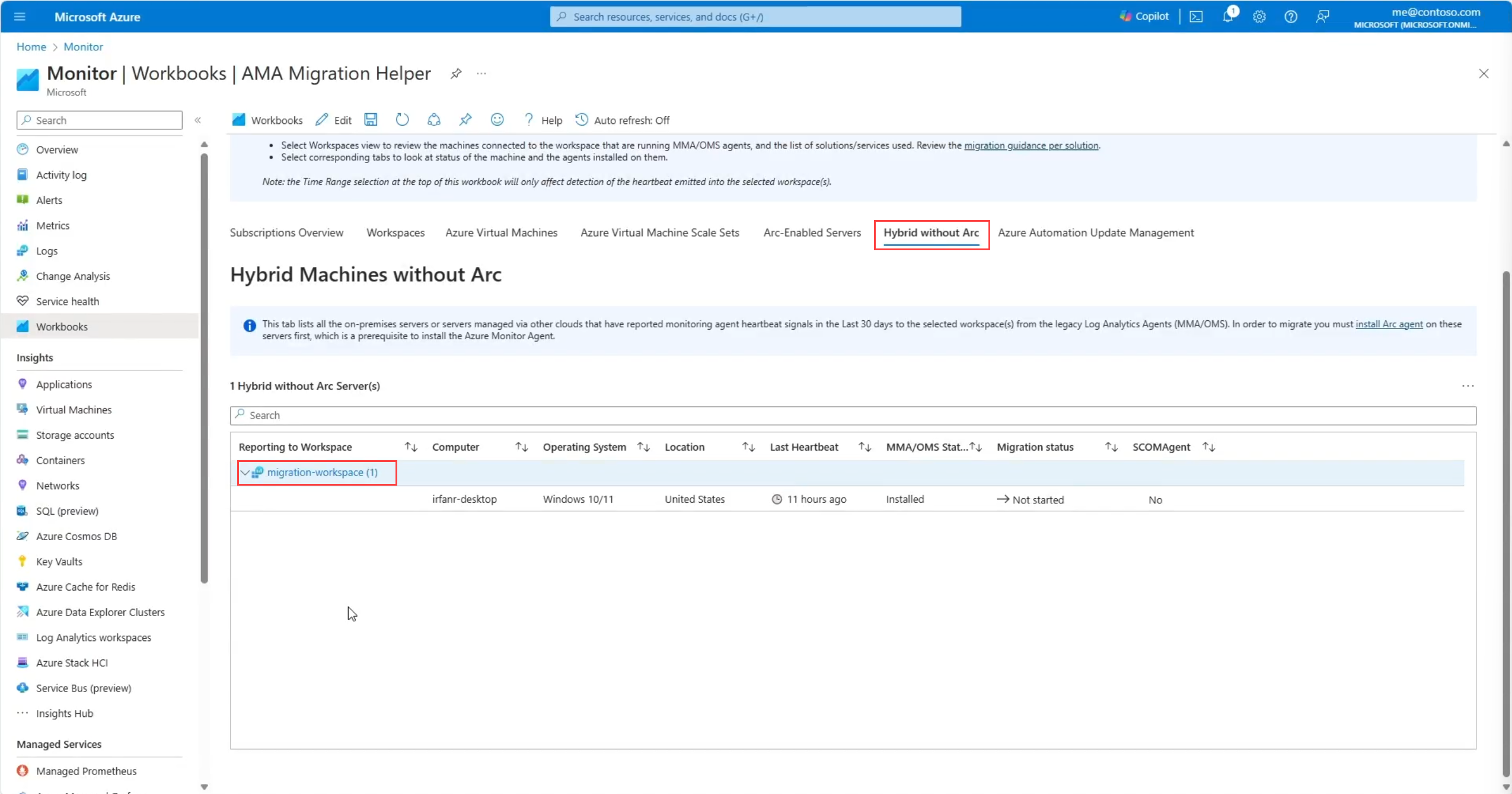 The Hybrid machines without Arc tab provide a detailed view of the hybrid machines in your subscriptions that aren't Arc-enables but have the legacy agent deployed. The table includes the Log Analytics workspace that the machine sends telemetry to, the last time the machine sent a heartbeat to the workspace