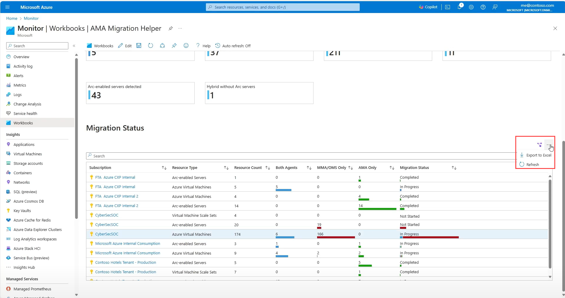 The workbook opens on the Subscriptions Overview tab. This page provides a high-level view of the resources in your subscriptions, which agents are deployed, and the migration status. Use this page to keep track of the migration status of your resources across your subscriptions.