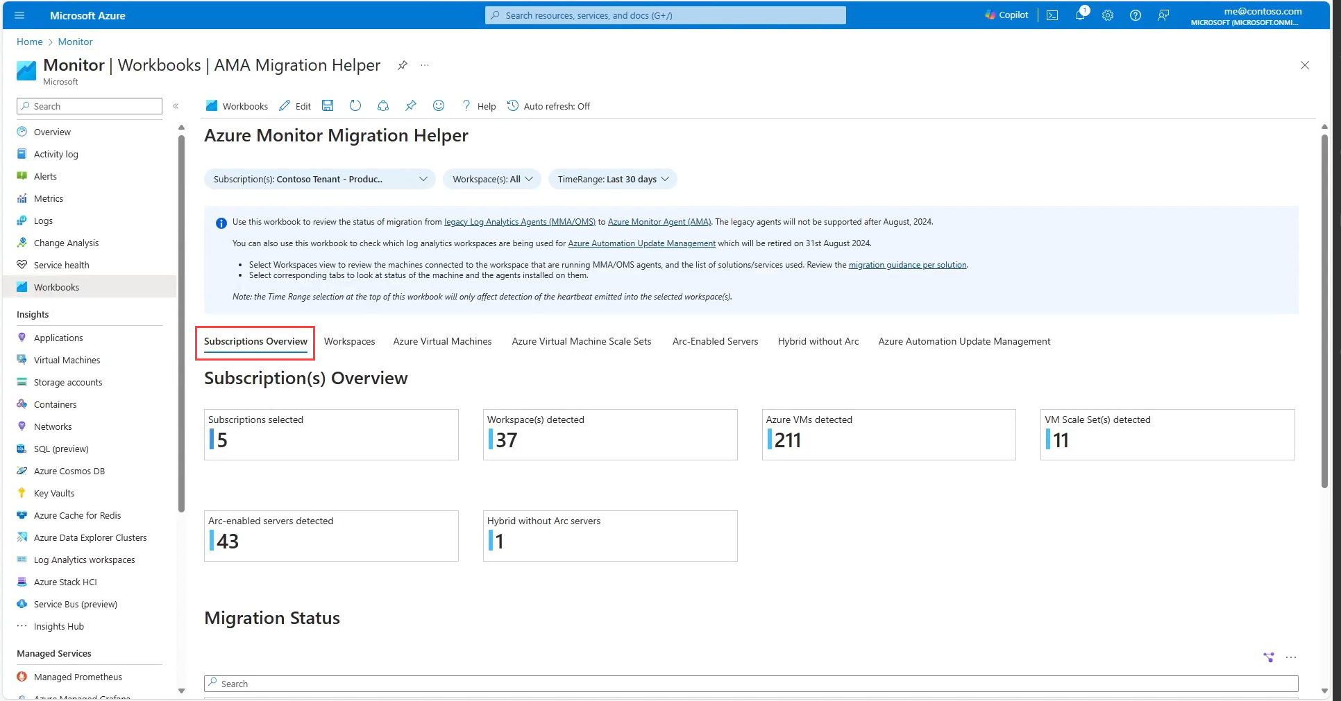 Azure Monitor Agent Migration Helper workbook is a workbook-based Azure Monitor solution that helps you discover what to migrate and track progress as you move from Log Analytics Agent to Azure Monitor Agent. Use this single pane of glass view to expedite and track the status of your agent migration journey. The helper now supports multiple subscriptions, and includes automatic migration recommendations based on your usage.