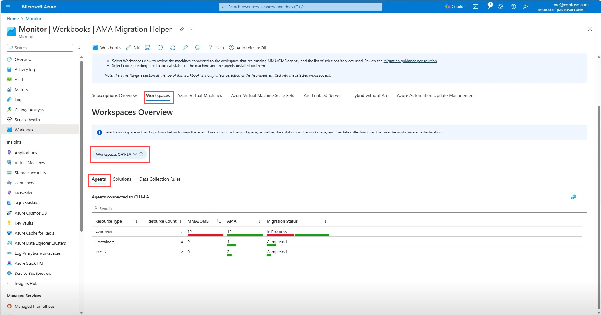 On the Agents tab, the table shows how many resources of each type are sending telemetry to the workspace, which agent is configured and the migration status.