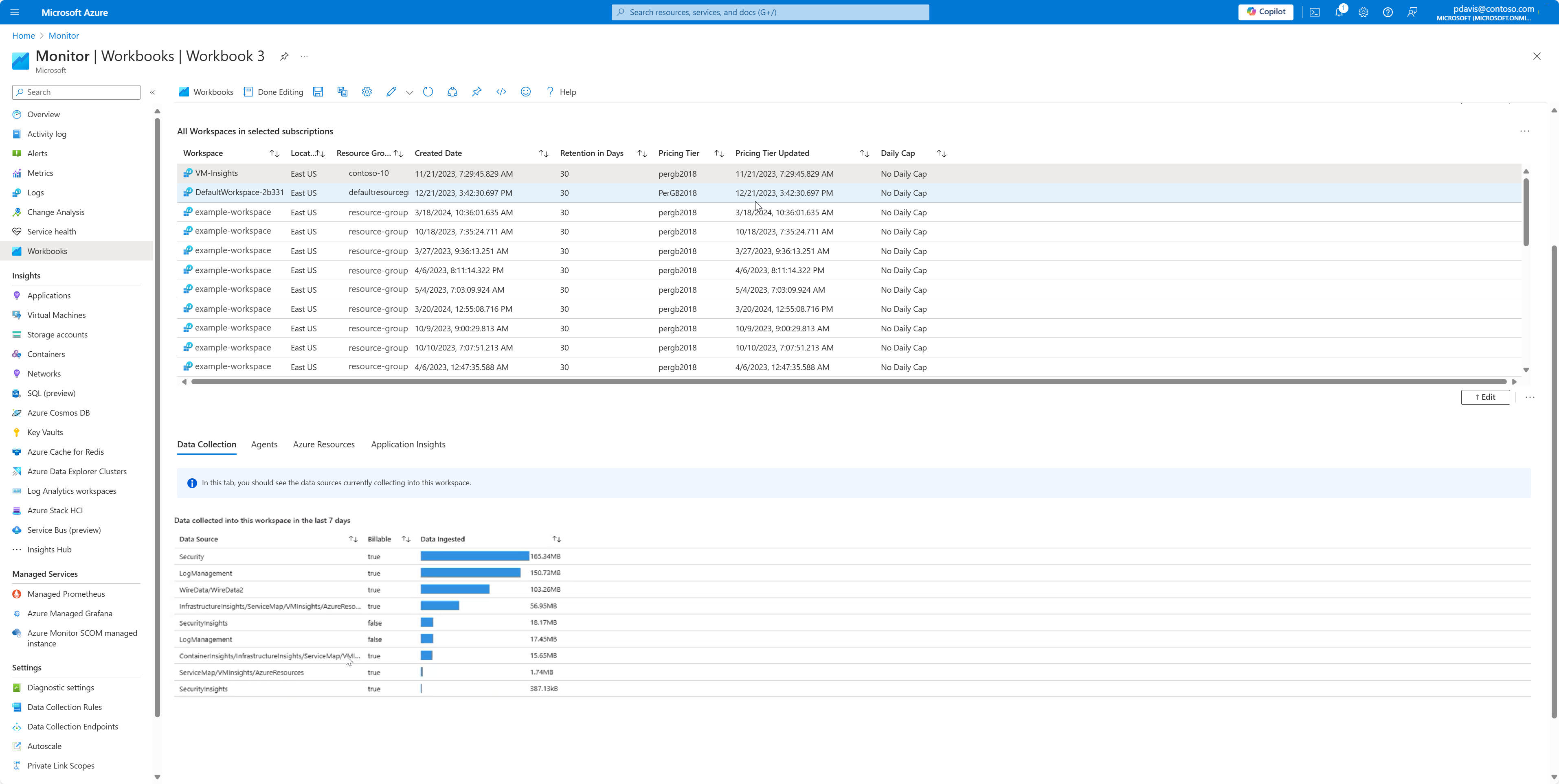 The Data Collection tab shows the data sources that have been collected into this workspace over th last seven days. The table includes the data source, whether it's billable and the volume of data ingested, and the last time data was received from that data source.