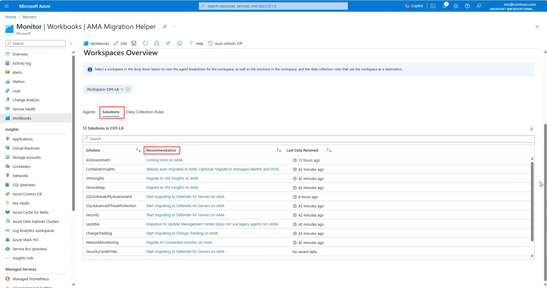 The Solutions tab shows the legacy solutions that have been deployed into the workspace and the recommended migration steps are for that specific solution. Select the recommendation for more information. The last time data any kind of logs or telemetry was received from teach solution is listed.