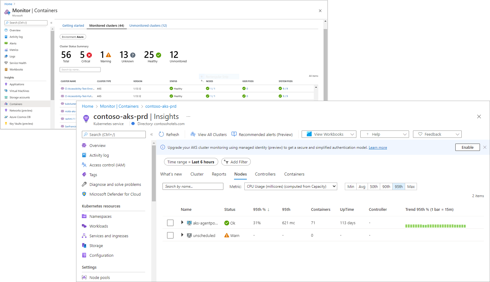 | Unified monitoring dashboard | The unified monitoring dashboard in the Azure portal consolidates data gathered by the different services for interactive analysis in a single screen. Get a high level status of your different clusters and then drill down into the details of individual clusters and their components. |