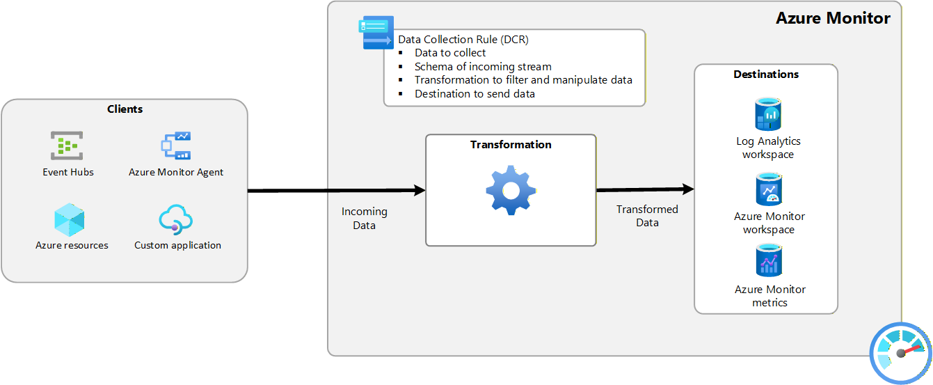 The data collection process supported by DCRs provides a common processing path for incoming data. Each data collection scenario is defined in a DCR. The DCR provides instructions for how Azure Monitor should process the data it receives. Depending on the scenario, DCRs specify all or some of the following: