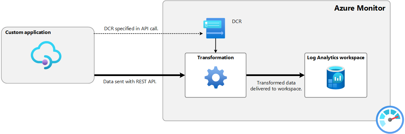 With direct ingestion, a particular DCR is specified to process the incoming data. For example, the following diagram illustrates data from a custom application using Logs ingestion API. Each API call specifies the DCR that processes its data. The DCR understands the structure of the incoming data, includes a transformation that ensures the data is in the format of the target table, and specifies a workspace and table to send the transformed data.
