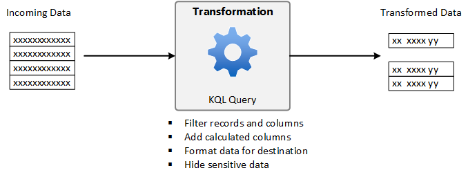 Transformations are KQL queries included in a DCR that run against each record received. They allow you to modify incoming data before it's stored in Azure Monitor or sent to another destination. You may filter unneeded data to reduce your ingestion costs, remove sensitive data that shouldn't be persisted in the Log Analytics workspace, or format data to ensure that it matches the schema of its destination. Transformations also enable advanced scenarios such as sending data to multiple destinations or enriching data with additional information.