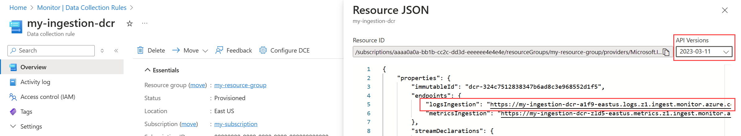 The DCR logs ingestion endpoint is generated when you create a DCR for direct ingestion. To retrieve this endpoint, open the DCR in the JSON view in the Azure portal. You may need to change the API version to the latest version for the endpoints to be displayed.