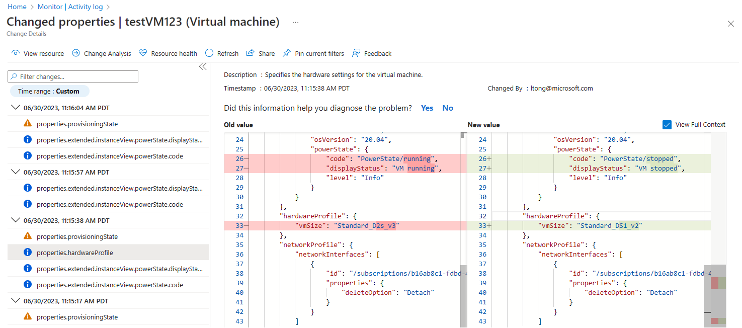 If any changes are associated with the event, you'll see a list of changes that you can select. Selecting a change opens the Change history page. This page displays the changes to the resource. In the following example, you can see that the VM changed sizes. The page displays the VM size before the change and after the change. To learn more about change history, see Get resource changes.