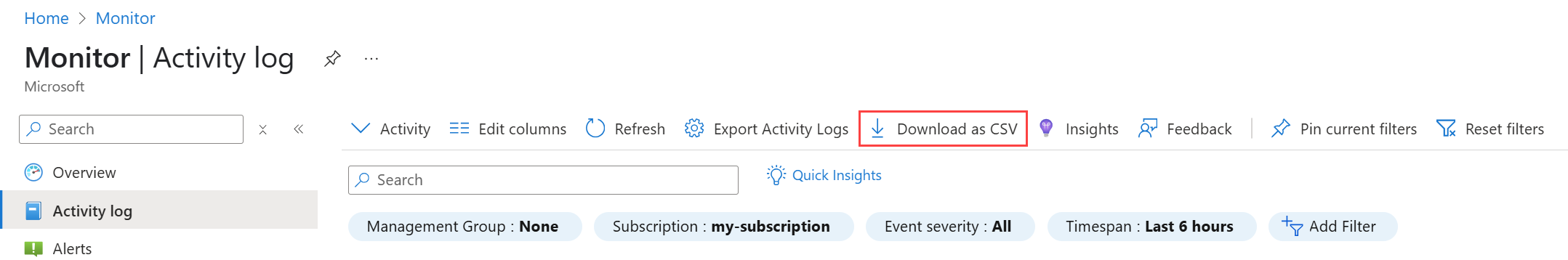 Select Download as CSV to export the activity log to a CSV file using the Azure portal.