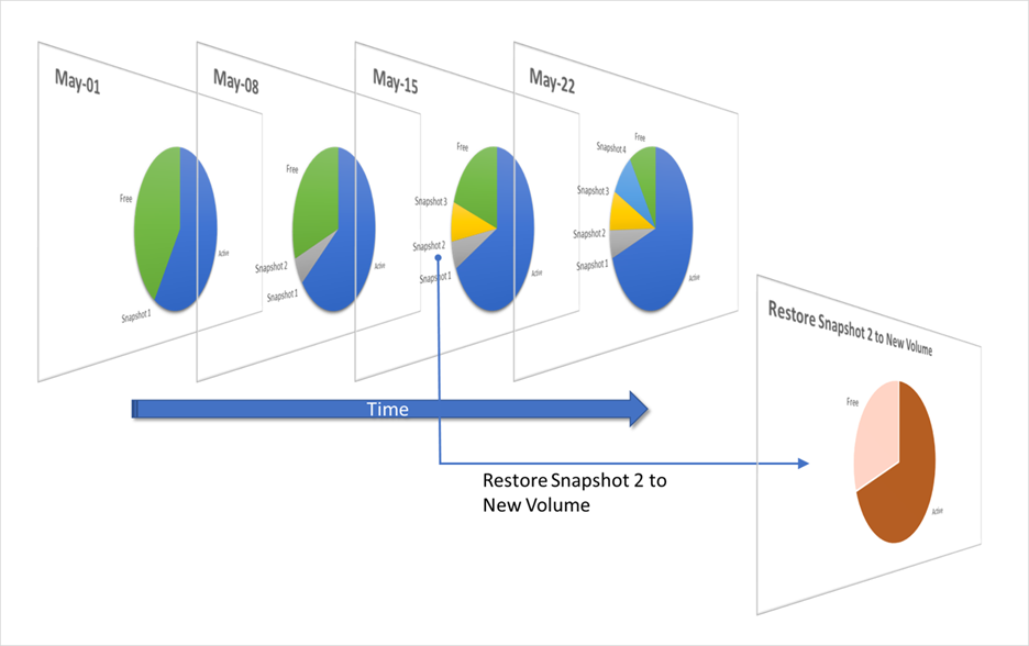 Snapshots consume storage capacity. As such, they aren't typically kept indefinitely. For data protection, retention, and recoverability, a number of snapshots (created at various points in time) are usually kept online for a certain duration depending on RPO, RTO, and retention Service Level Agreements (SLA) requirements. Snapshots can be deleted from the storage service by an administrator at any time. Any snapshot can be deleted regardless of the order in which it was created. Deleting older snapshots frees up space.