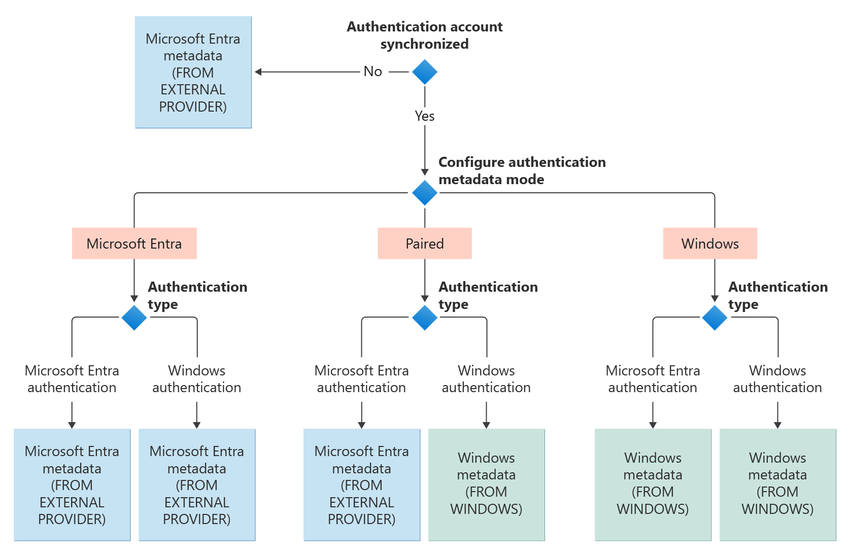 Previously, customers who synchronize users between AD and Microsoft Entra ID wouldn't be able to authenticate with a login created from a Windows principal, whether they used Windows authentication or Microsoft Entra authentication that was synced from AD. With the Windows authentication metadata mode, customers can now authenticate with a login created from a Windows principal using Windows authentication or the synchronized Microsoft Entra principal.