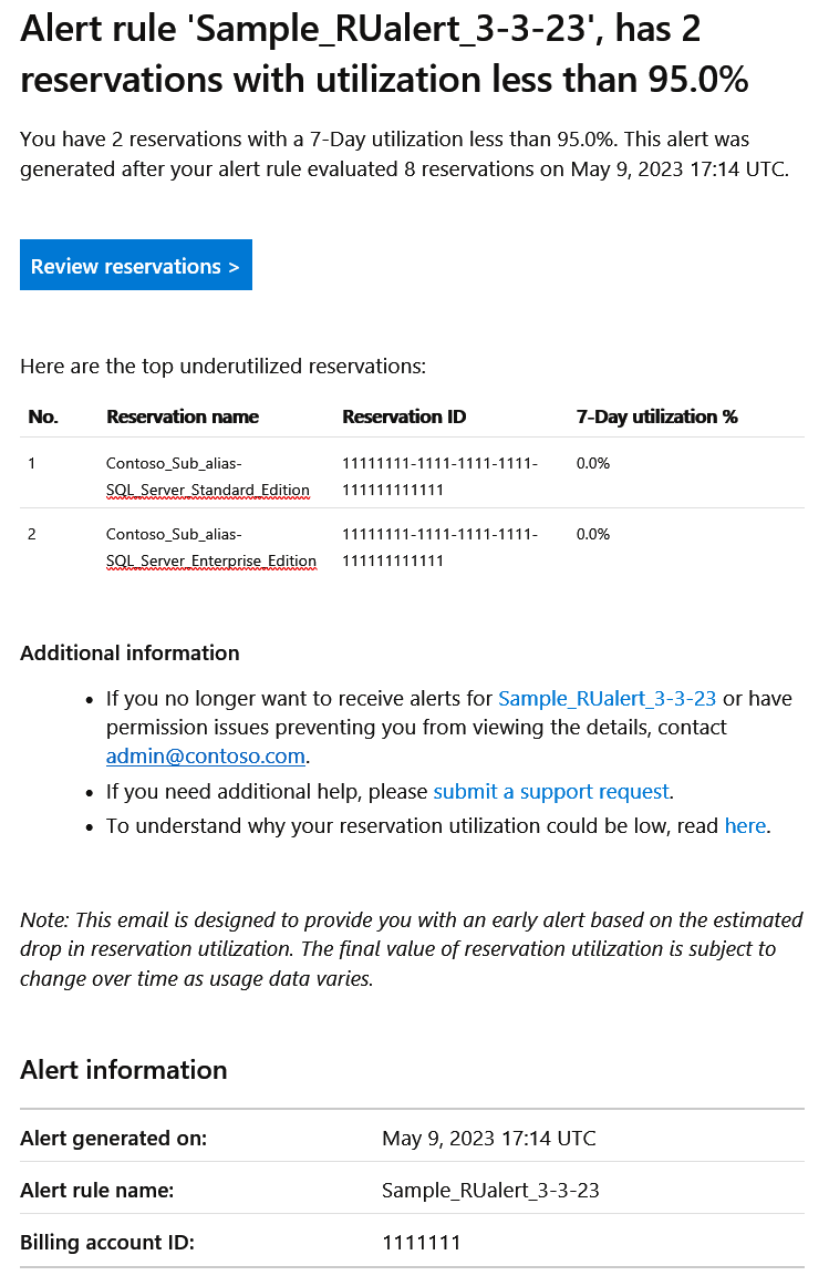 This article helps you set up and use reservation utilization alerts. The alerts are email notifications that you receive when reservations have low utilization. Azure reservations can provide cost savings by committing to one-year or three-year plans. However, it's possible for reservations to go unutilized or underutilized, resulting in financial losses. If you have Azure RBAC permissions on the reservations or if you're a billing administrator, you can review the utilization percentage of your reservation purchases in the Azure portal. With reservation utilization alerts, you can promptly take remedial actions to ensure optimal utilization of your reservation purchases.