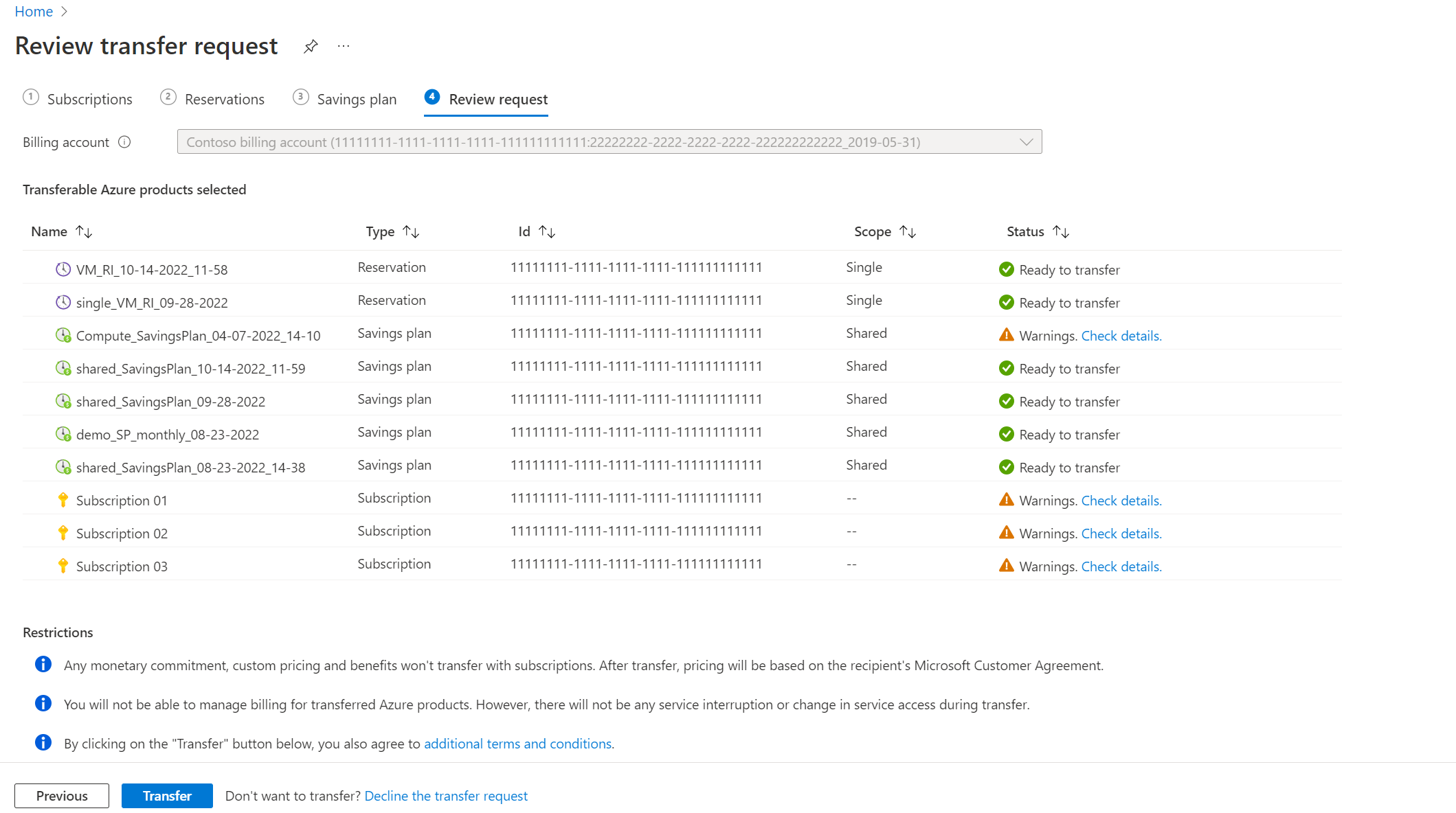 - Warnings - There's a warning for the selected Azure product. While the product can still be transferred, doing so has some consequence that the user should be aware of in case they want to take mitigating actions. For example, the Azure subscription being transferred is benefitting from a reservation. After transfer, the subscription will no longer receive that benefit. To maximize savings, ensure that the reservation is associated to another subscription that can use its benefits. Instead, the user can also choose to go back to the selection page and unselect this Azure subscription. Select Check details for more information.