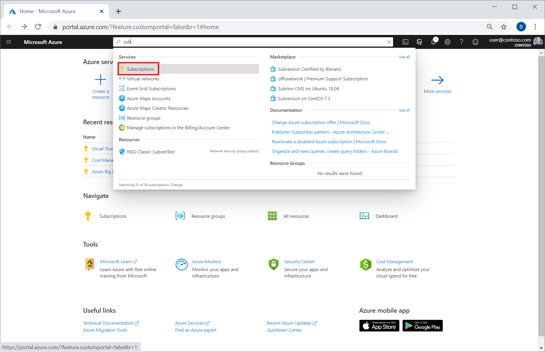 In the Azure portal, type subscriptions in the search box and then select Subscriptions.