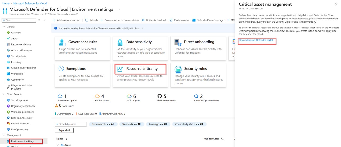 In the Defender for Cloud portal, go to Environment settings > Resource criticality.