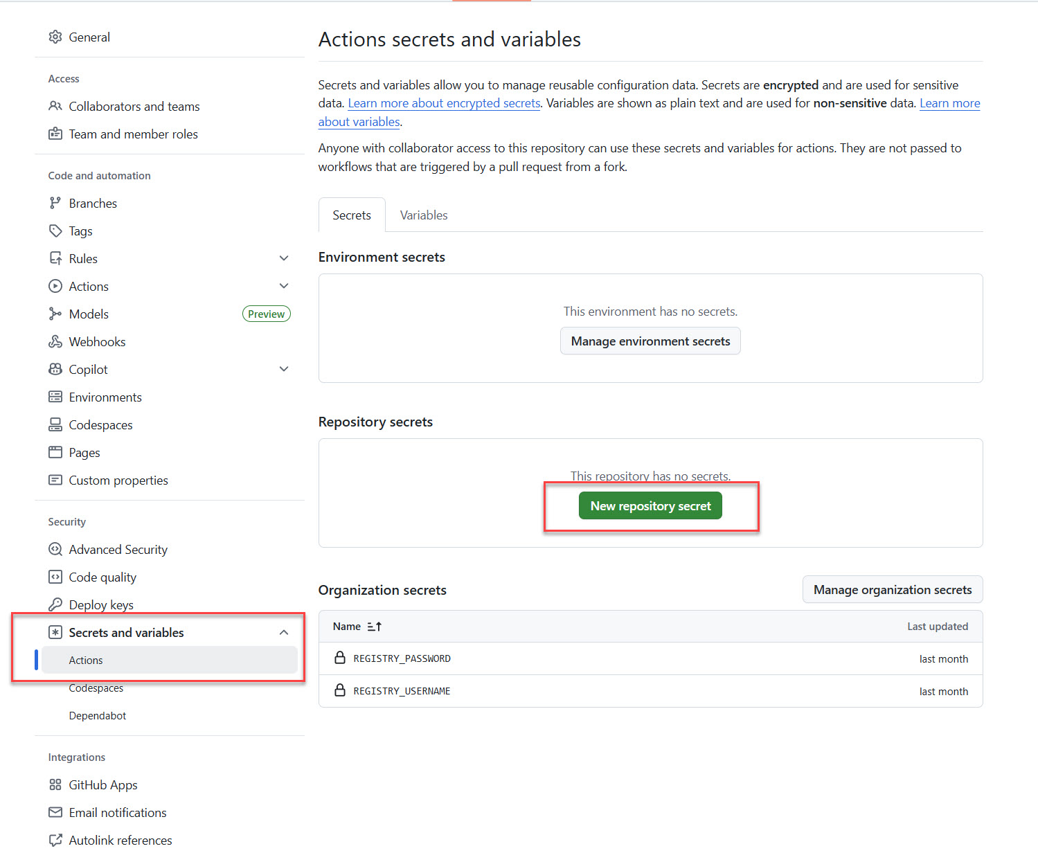 On the left pane, select Secrets and variables > Actions. Then select New repository secret.