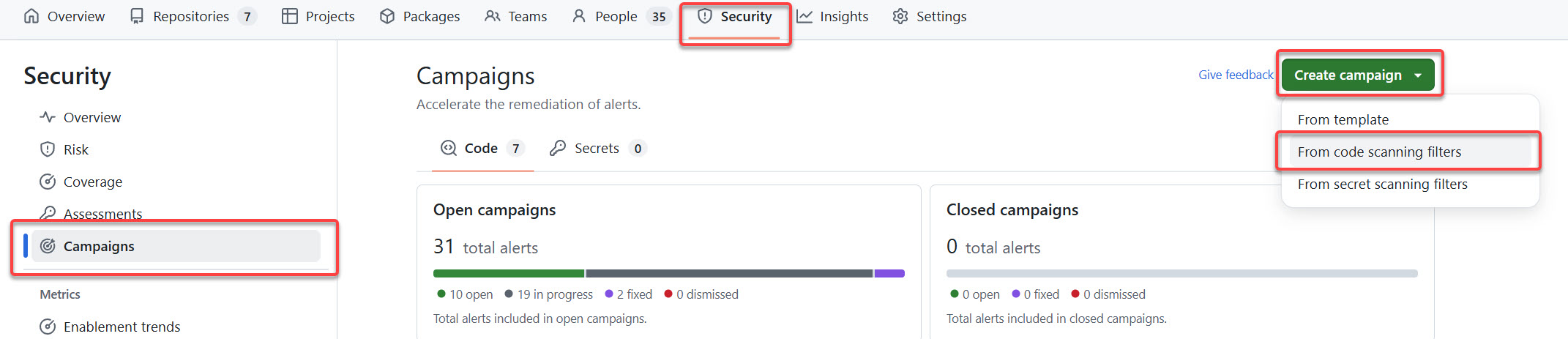 To create a scanning campaign, you must work at the GitHub organization level. This experience is not available at the individual repository level.