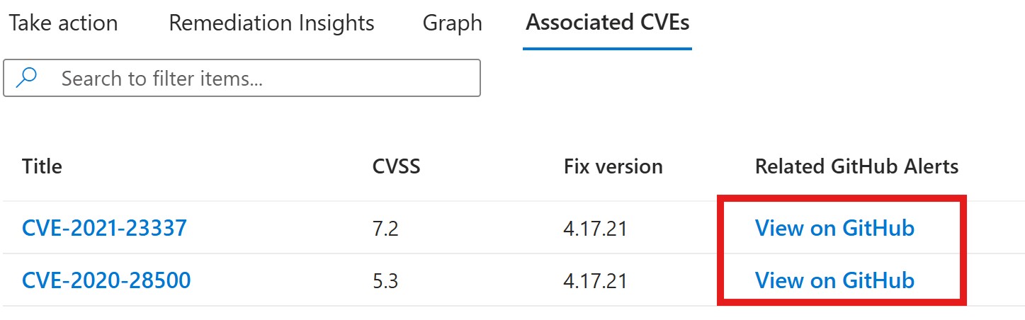 Within Defender for Cloud, security managers can see which security issues the engineering team already knows about, along with the status of those issues. Security managers open this view by selecting the View on GitHub link.