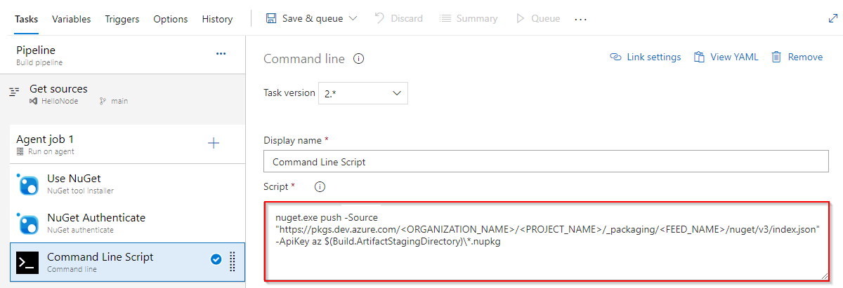 - task: NuGetToolInstaller@1 # Minimum required NuGet version: 4.8.0.5385+. displayName: 'NuGet Tool Installer' - task: NuGetAuthenticate@1 inputs: nuGetServiceConnections: <SERVICE_CONNECTION_NAME> - script: | nuget.exe push -Source "https://pkgs.dev.azure.com/<ORGANIZATION_NAME>/<PROJECT_NAME>/_packaging/<FEED_NAME>/nuget/v3/index.json" -ApiKey az $(Build.ArtifactStagingDirectory)\*.nupkg displayName: Push