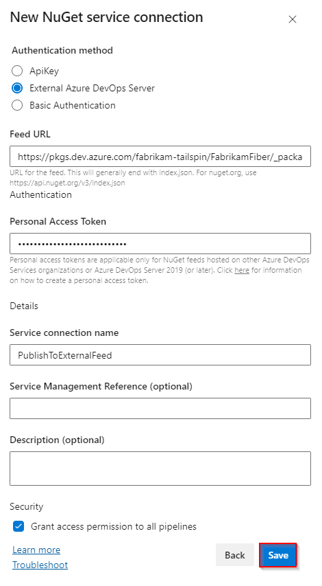 Select External Azure DevOps Server as the Authentication method, and then enter your target Feed URL. Paste the Personal Access Token you created earlier, provide a name for your service connection, and check Grant access permission to all pipelines if applicable to your scenario.