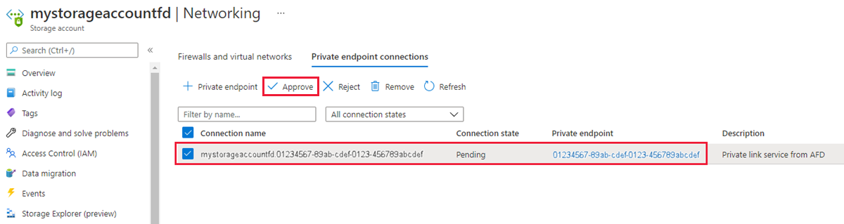 Resource IDof the private endpoint connection from the output.az network private-endpoint-connection list --name 'mystorage' --resource-group 'myResourceGroup' --type 'Microsoft.Storage/storageAccounts'Use the az network private-endpoint-connection approve command to approve the private endpoint connection.