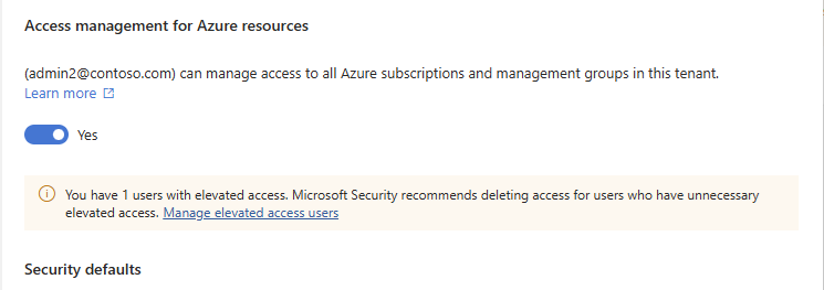When you set the toggle to Yes, you are assigned the User Access Administrator role in Azure RBAC at root scope (/). This grants you permission to assign roles in all Azure subscriptions and management groups associated with this Microsoft Entra tenant. This toggle is only available to users who are assigned the Global Administrator role in Microsoft Entra ID.