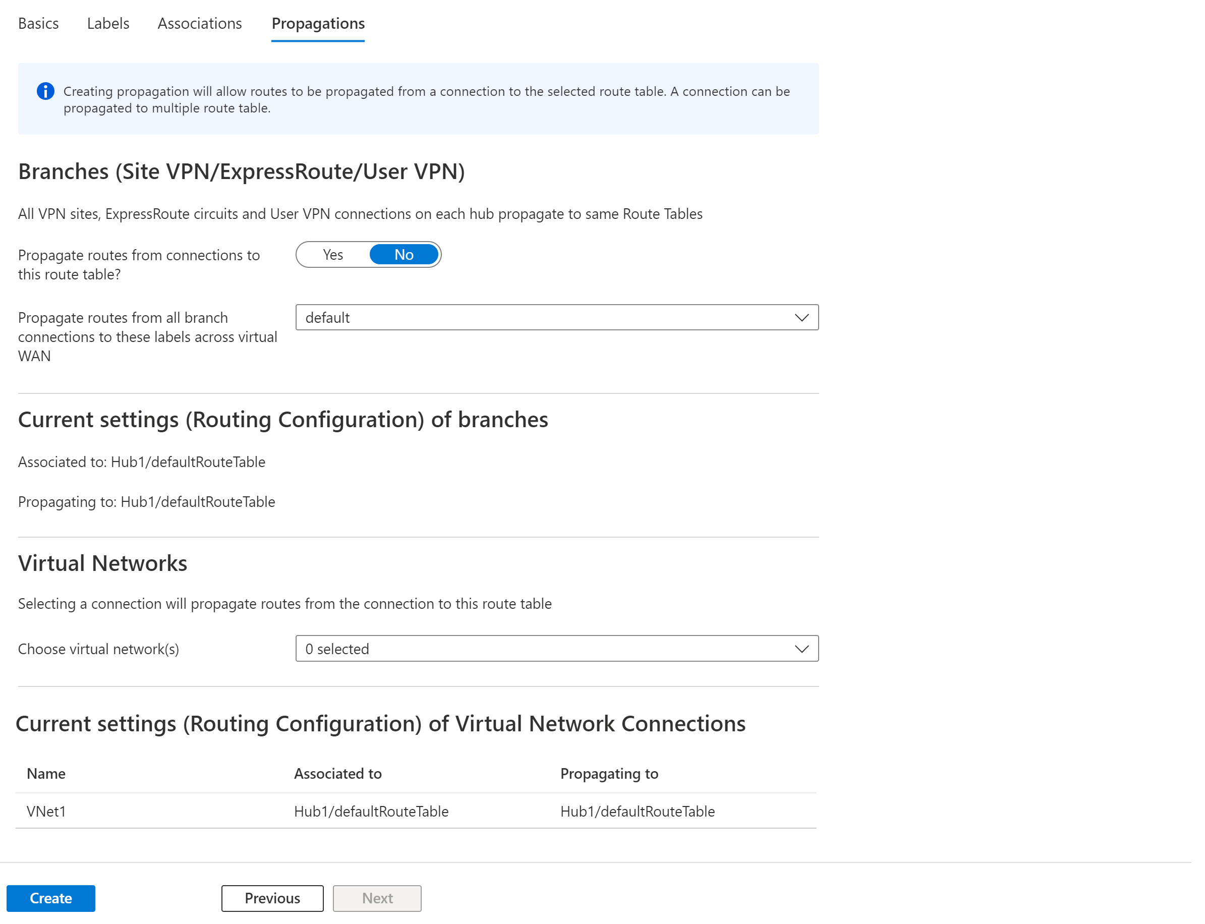 - Propagate static route: This setting lets you propagate static routes defined in the Static routes section to route tables specified in Propagate to Route Tables. Additionally, routes will be propagated to route tables that have labels specified as Propagate to labels. These routes can be propagated inter-hub, except for the default route 0/0.