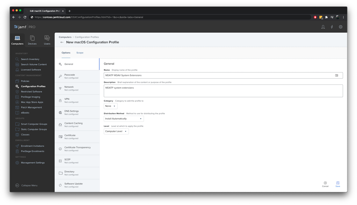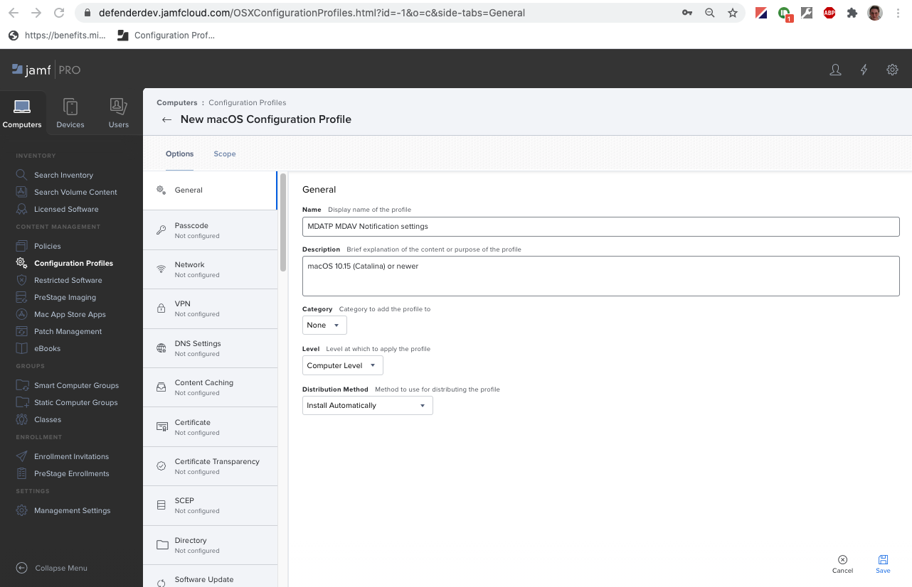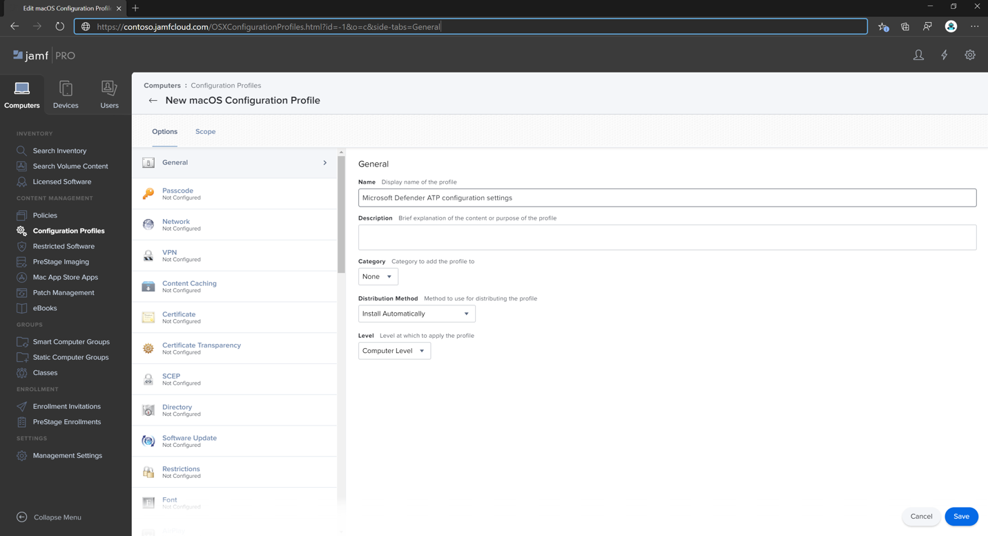 MDATP_MDAV_configuration_settings.plist.In the Jamf Pro dashboard, open Computers, and their Configuration Profiles. Select New and switch to the General tab.
