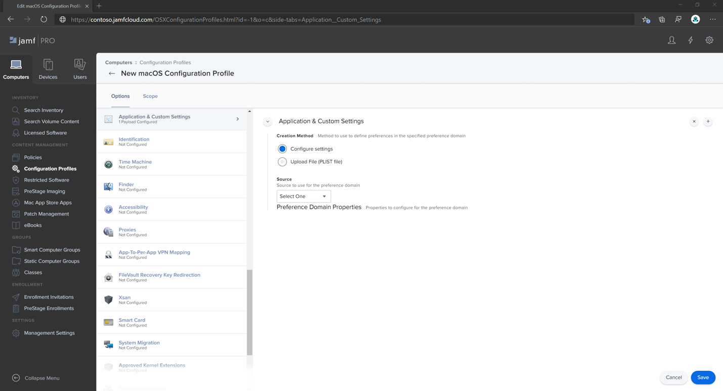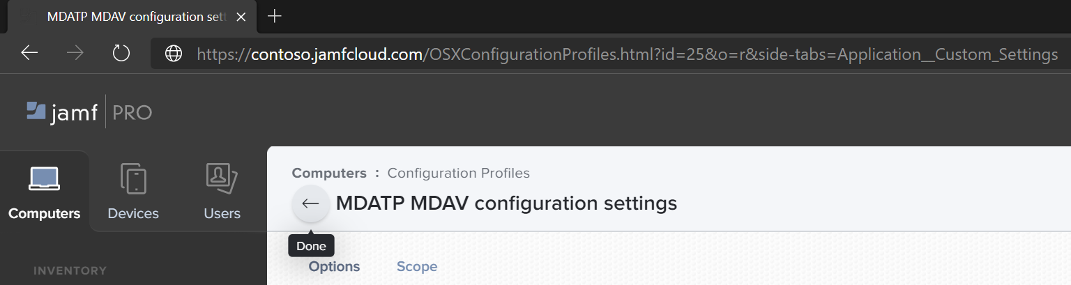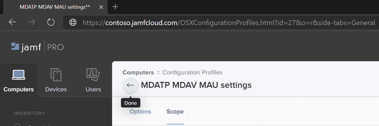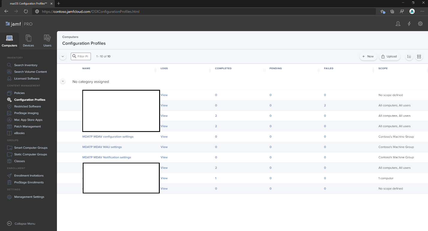 MDATP_MDAV_configuration_settings.plist.In the Jamf Pro dashboard, open Computers, and their Configuration Profiles. Select New and switch to the General tab.