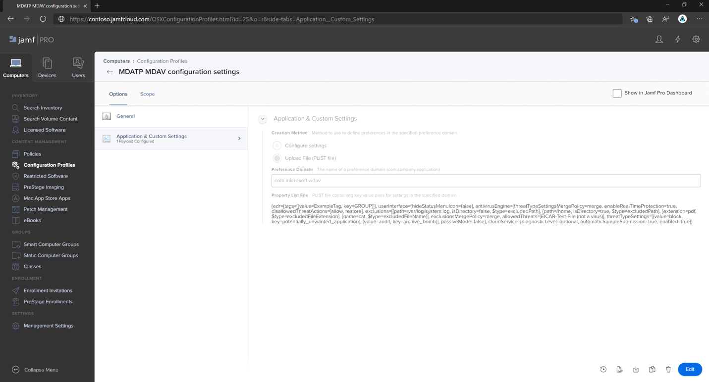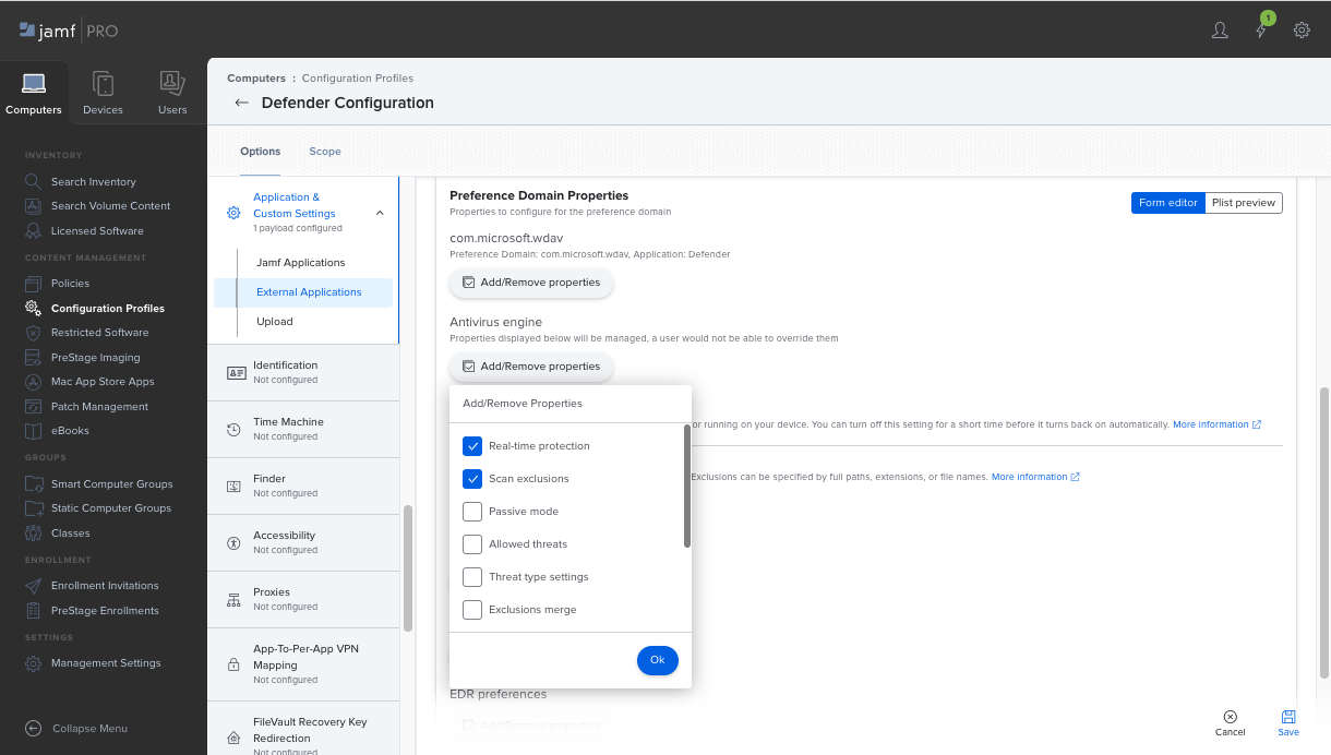 You can either use Jamf Pro GUI to edit individual settings of the Microsoft Defender for Endpoint configuration, or use the legacy method by creating a configuration Plist in a text editor, and uploading it to Jamf Pro.